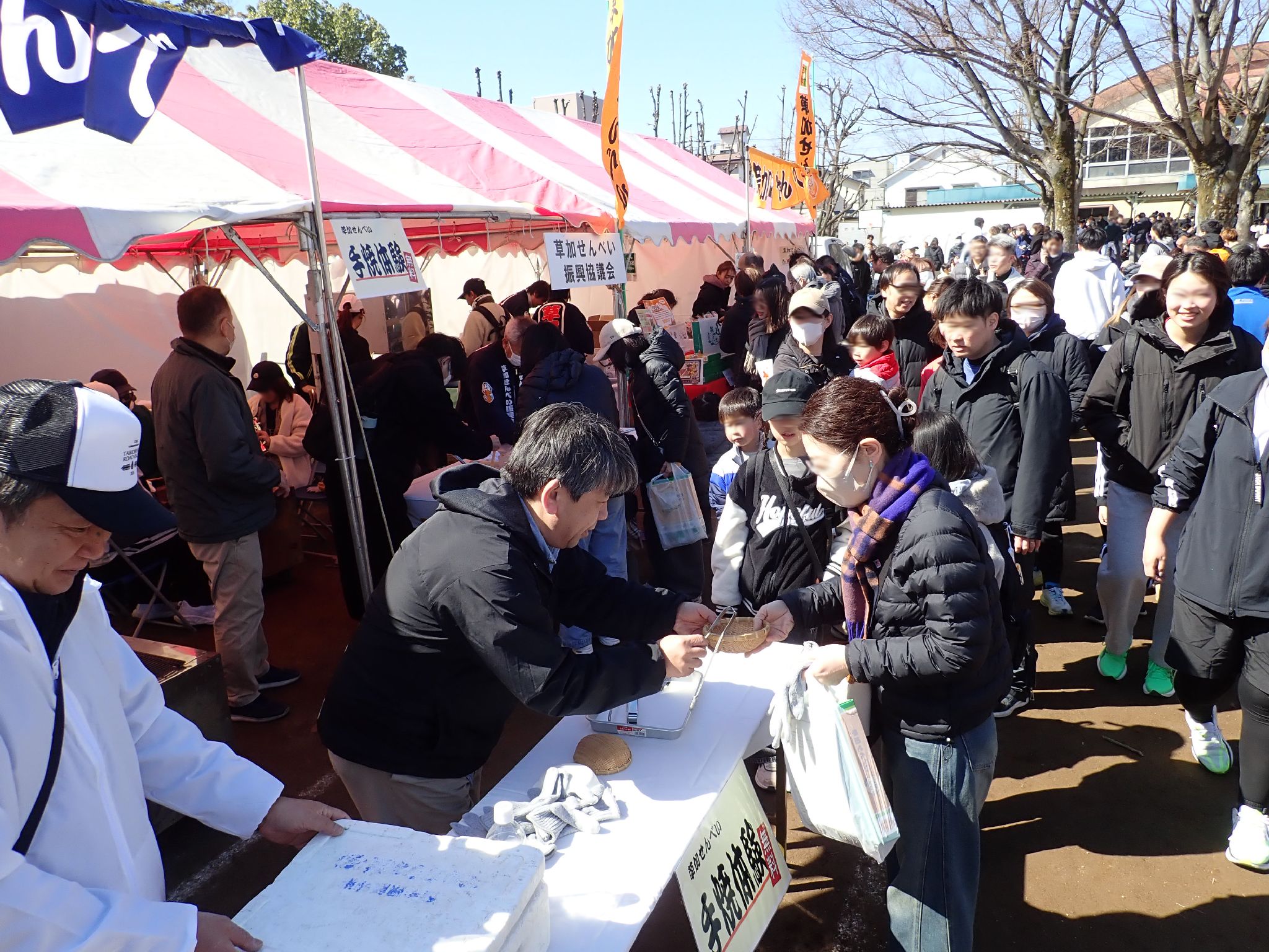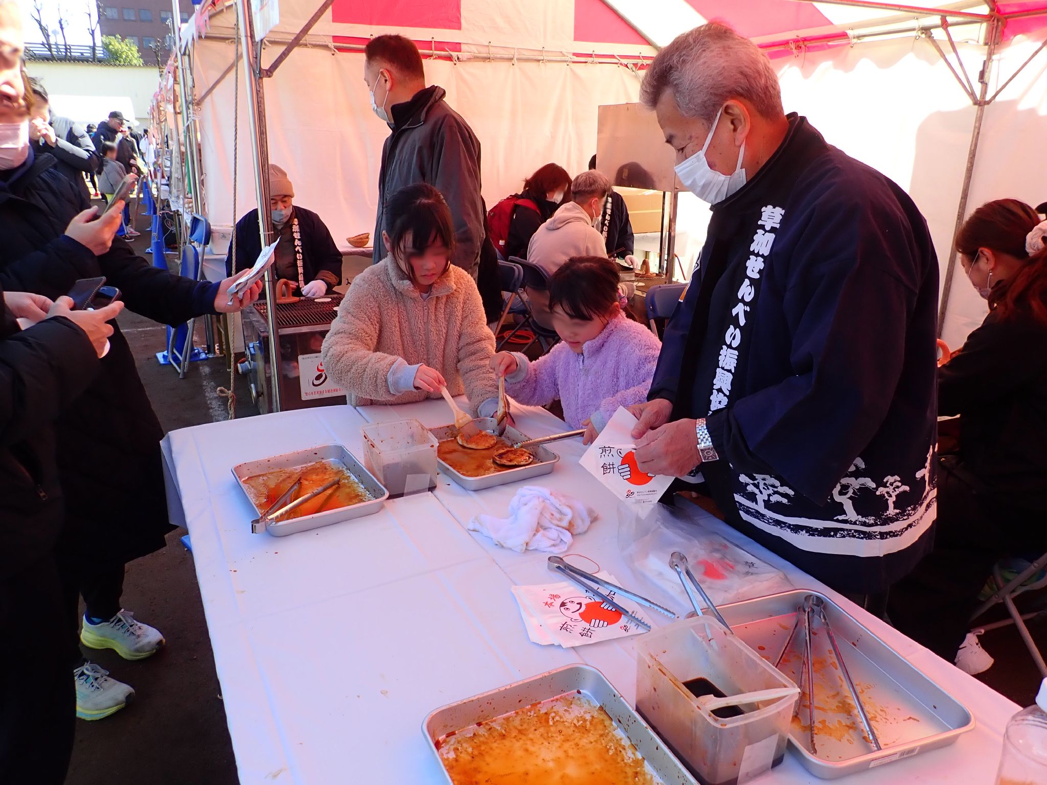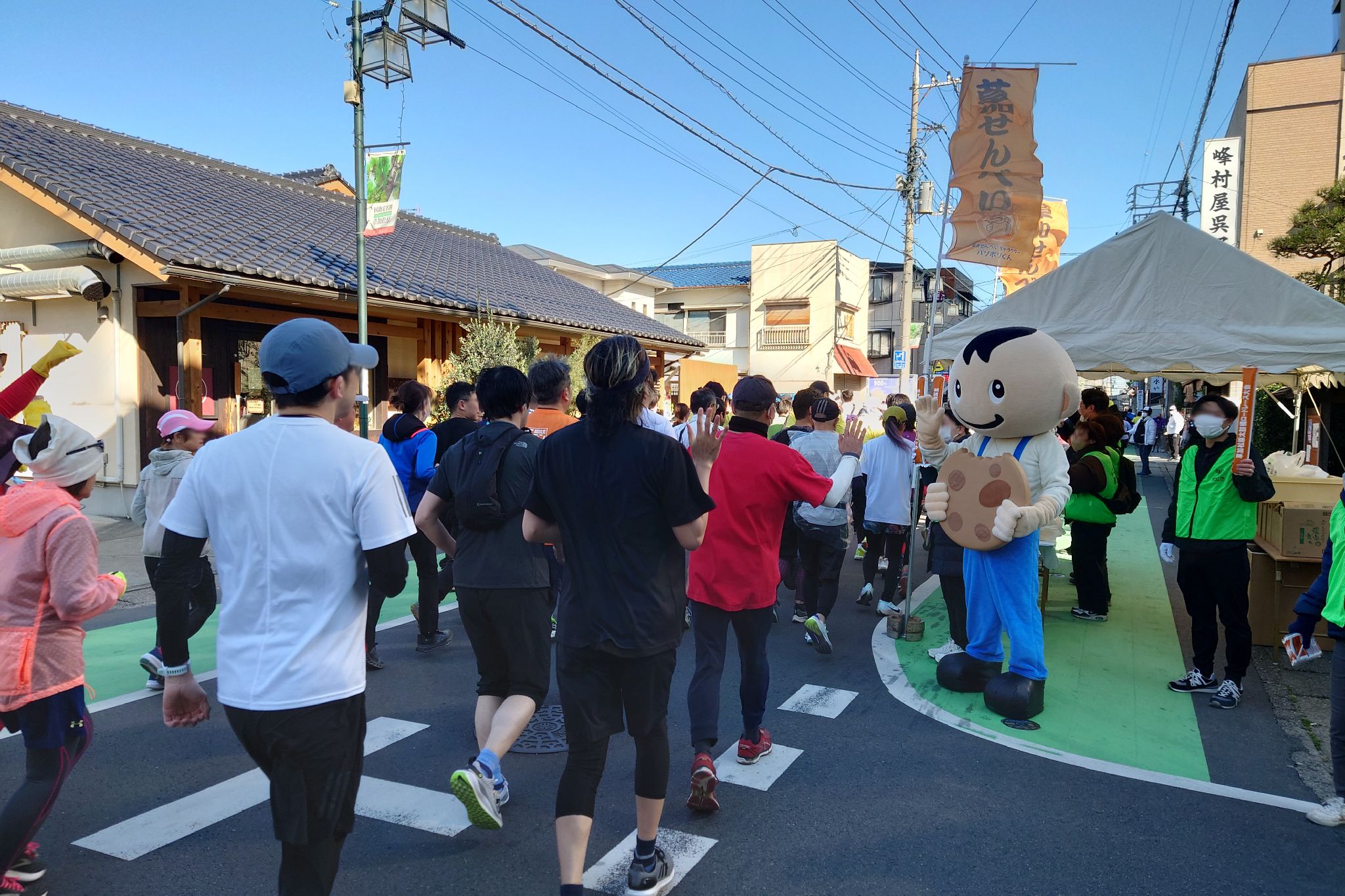 冷たい強風が吹く中での開催でしたから、暖を取りながらの手焼き体験は大盛況でした。 給水所ならぬ「久助所」では、草加せんべいの補給が出来てたくさんのランナーが足を止めてまで立ち寄ってくださり、パリポリくんともハイタッチができましたね。
