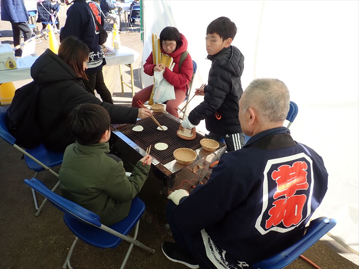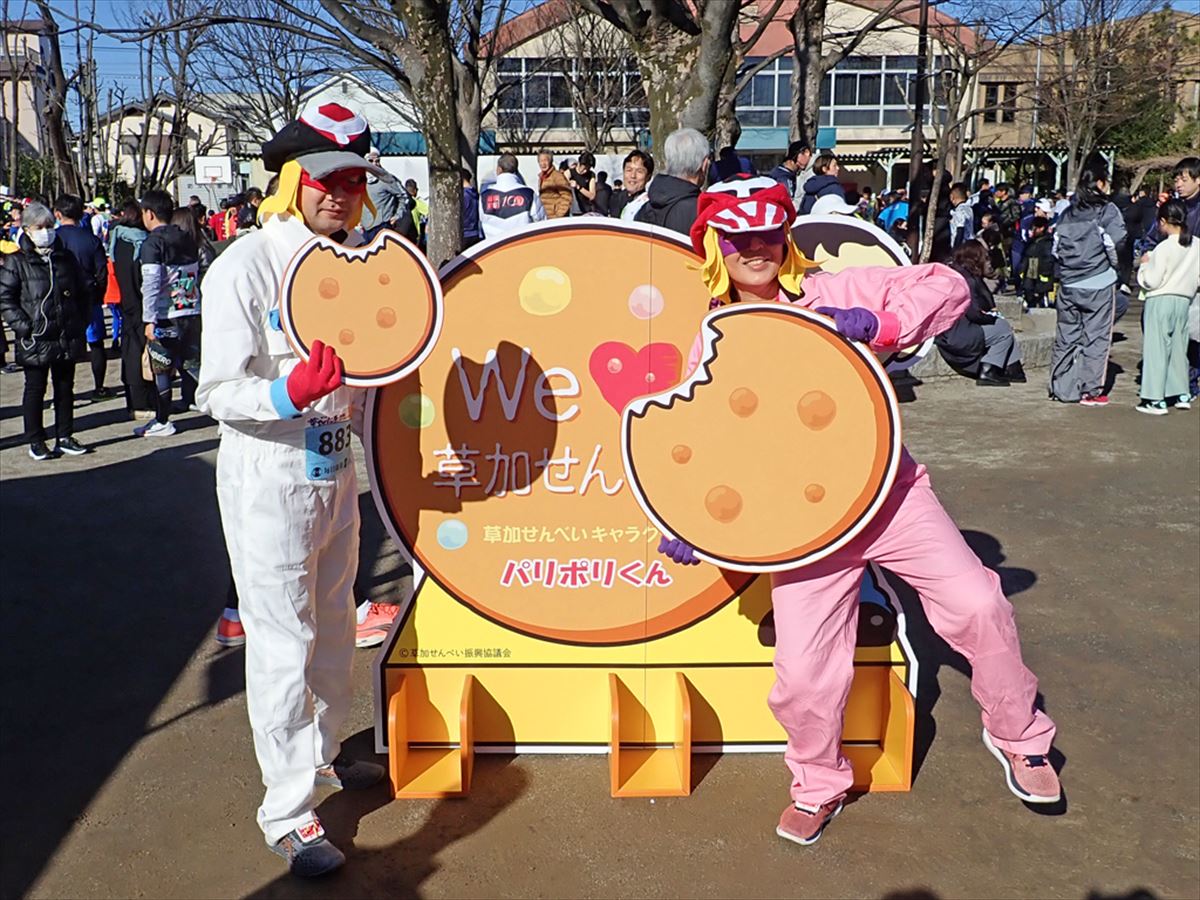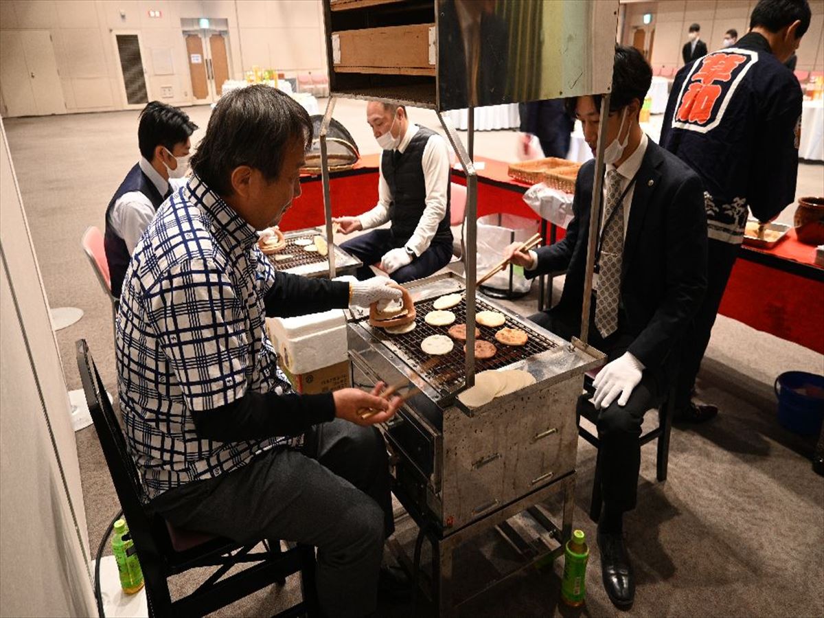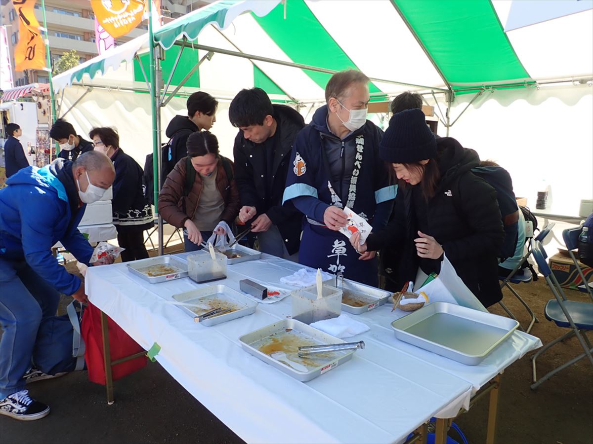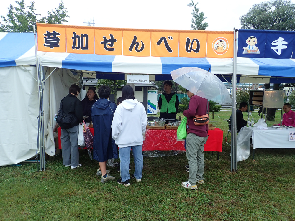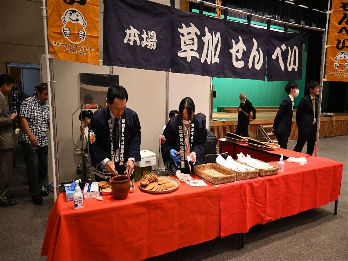 草加せんべい振興協議会からは、会員事業者の有志より草加せんべいの生地と草加せんべいを寄付させていただきました。