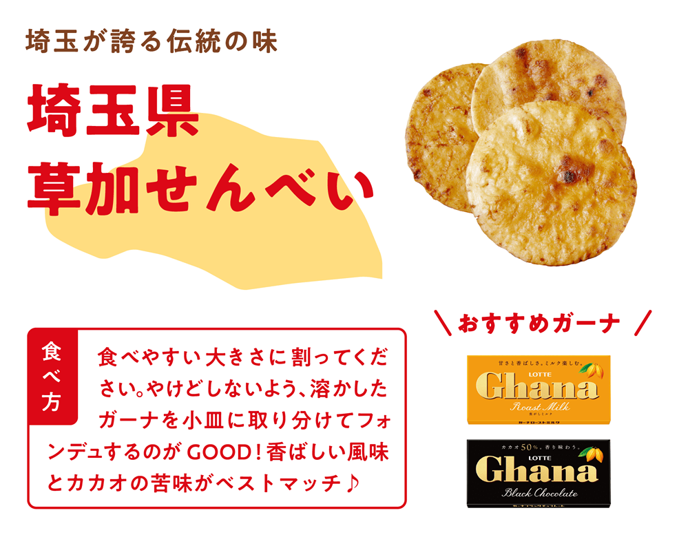 LOTTEが、ガーナチョコレートと全国の食材とのコラボレーションを展開する中で、埼玉県代表食材として「草加せんべい」が選ばれました! チョコレートフォンデュに「草加せんべい」をつけて食べることを提案されています。