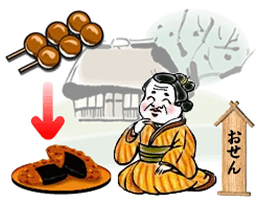 草加が日光街道の宿場町として栄えていた頃、旅人相手の茶店が街道にありました。その茶店のおせんさんという女性が作って売っていたお団子が非常においしく、当時往来の人達に大変親しまれていました。このおせんさんは、商売上手な人でだんごを使った新しい商品が作れないかと考えていました。ある日、武者修行の侍が茶店に立ち寄り「おせんさん、お団子をつぶして天日で乾かして焼餅として売っては?」と教えてくれました。おせんさんは早速売り出してみたところ、お客様に好評で喜ばれ、日光街道に名物が出来たというのが、今の草加せんべいと伝えられています。